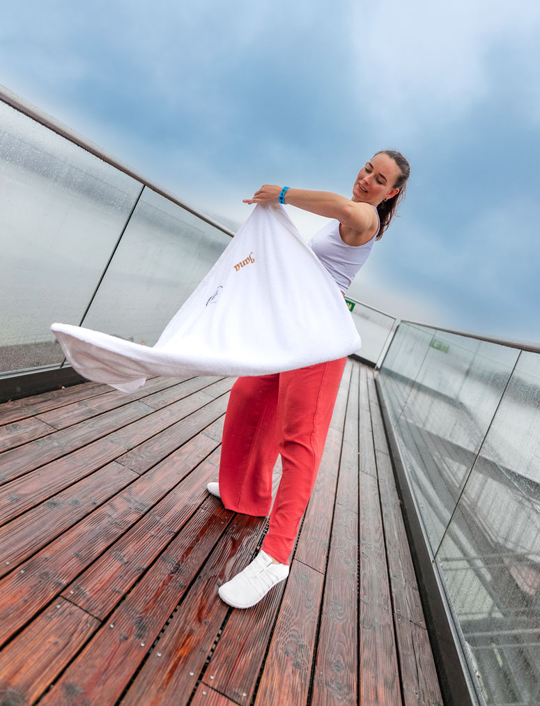 In the 3rd round, the two must cooperate. Before the infusion, they have some preparation time to choose a song together and create a choreography. The 4th round is the final battle: here, it’s all or nothing. Both must freestyle to music they do not know. Breathtaking acrobatics at over 80°C make the "Masters Freestyle Aufguss" a unique extreme sports event.